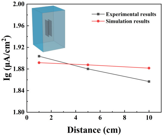 Simulation results and experimental results of corrosion current at various distances.