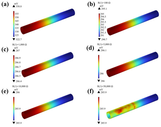 The opposite surface potential distribution of pipe in direct contact and connection with different resistance values: (a) 0; (b) 100 Ω; (c) 1000 Ω; (d) 5000 Ω; (e) 10,000 Ω; (f) 50,000 Ω.
