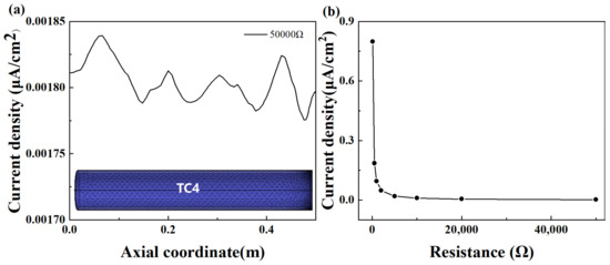 (a) The surface current density distribution of TC4 pipe in the electrolyte at a connection resistance of 50,000 Ω; (b) maximum current density with different connection resistance values.