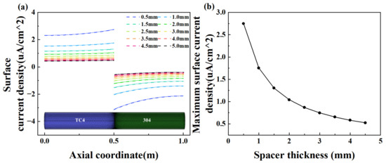 (a) The current density distribution along the TC4 and 304 surfaces in the electrolyte with various spacer thicknesses; (b) maximum current density with different spacer thicknesses.