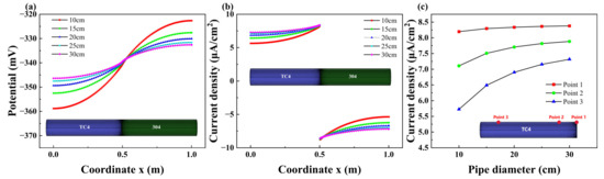 Galvanic corrosion simulations were conducted on pipes with five different diameters, ranging from 10 cm to 30 cm in 5 cm intervals, while other conditions were kept constant. Figure 10 illustrates the axial variation curve of galvanic corrosion current density for these different pipe diameters. It is evident that the current density increases gradually with the enlargement of the pipe diameter, leading to an intensified degree of corrosion. Additionally, as the pipe diameter increases, the galvanic corrosion potential of the TC4 pipeline shifts positively, while the potential of the 304 pipeline shifts negatively due to the hindrance of the corrosion reaction during the cathodic process.