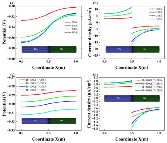 Variations of potential (a) and current density (b) in direct contact at different temperatures; variations of potential (c) and current density (d) at a connection resistance of 100 Ω at different temperatures.
