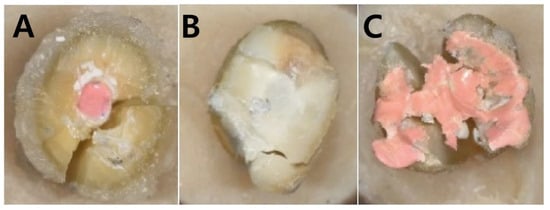 Evaluation of fracture modes: representative images were obtained from each group at 12.5× magnification. (A) adhesive failure: fracture of the interface between root canal sealer and dentin; (B) cohesive failure: fracture within canal sealer or dentin excluding the dentin-sealer border; (C) mixed-type fracture: destruction of canal filling material and dentin, including the dentin-sealer border.