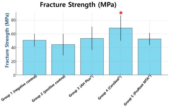 Mean of the fracture strength (MPa) of each group. Error bars present the standard deviations. A red asterisk (*) indicates a statistically significant difference compared to other groups (p < 0.05).