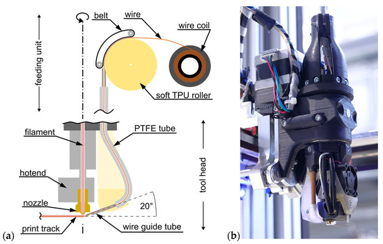 The developed setup is shown in detail in Figure 1. The tool head contains a hot end consisting of a heater and a nozzle for the extrusion of thermoplastics, as well as a cannula that guides the wire onto the component at an angle of 20°. Both the wire and the molten polymer are discharged in a length-controlled manner using the feeding unit. The end of the wire-feeding cannula has a 2 mm offset from the polymer nozzle, so the wire is exposed along this path. This offset is fixed in the current design of the tool head and provides sufficient spacing to the nozzle to not transfer heat while not decreasing the guiding functionality much. Furthermore, a blade is mounted on the tool head so that the deposited wire can be cut. The controlled polymer extrusion allows a selective and variable amount of embedding material to surround the wire and bond it to the base part.