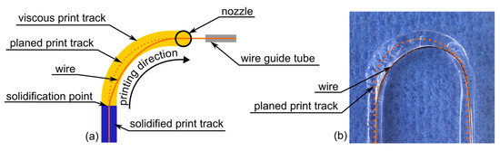 Although the polymer nozzle itself is arranged on the rotational axis and the direction of the wire feed can therefore be changed without affecting the polymer extrusion, investigations in the past have shown that deviations of the wire position occur when printing narrow curves [10,13]. Directly after extruding the polymer, the print track has not yet completely solidified, which allows the wire to move within the print track. The motion of the nozzle while printing curves pulls the wire to the inside of the curve, as shown in Figure 2.