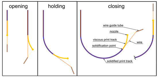 As soon as the nozzle of the tool head reaches the starting point of the circular arc, the wire feed with the cannula rotates so that the wire is held in line with the previous linear track until the solidification point reaches the beginning of the circular arc (Figure 3, opening phase). The resulting angular offset is then kept constant, and the wire feed rotates with the movement of the nozzle (Figure 3, holding phase). When the nozzle reaches the end point of the circular arc, it moves in a straight line on the following path element, while the wire feed continues to rotate and keeps the wire tangential at the solidification point, gradually reducing the angle offset (Figure 3, closing phase). As soon as the solidification point reaches the end point of the circular arc, the direction of movement of the nozzle and wire feed will be collinear again. To implement this strategy in the WEAM process, it is necessary to calculate the axis positions and convert them into a corresponding G-code to guide the movement of the printer during the three phases.