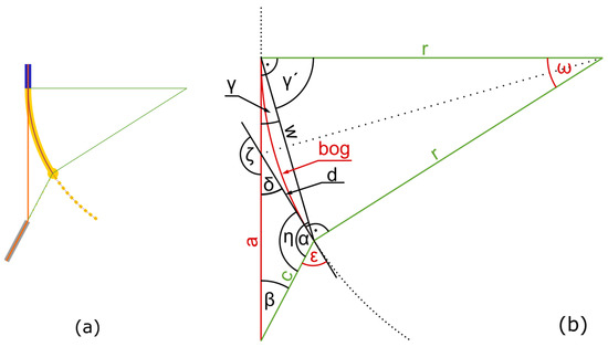(a) Schematic representation of the positions of the components involved in the printing process after applying the angular offset at the beginning of the bend (opening phase of Figure 3); (b) representation of the geometric relationships for calculating the angular offset: known variables are shown in green, sought-after variables in red.