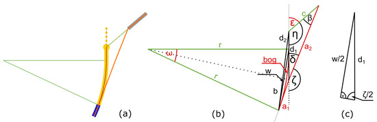 The only unknown length in Equation (15) is d, which can be calculated with Equation (18). One part of length d is known due to Equation (14), and the missing d2 can be obtained by the sine theorem of the triangle shown in Figure 5c: