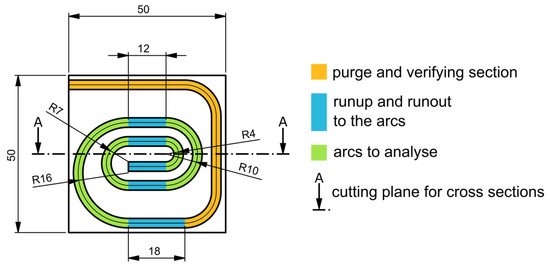 To validate the correction model as well as to subsequently optimize the process parameters, various test prints must be carried out in which the quality of the print can be evaluated based on the position of the wire and its embedding. Therefore, a new specimen geometry, as shown in Figure 6, was constructed. A 3 mm wide track was provided on the specimen for depositing the wire. The track started with a purge and verification section (yellow part in Figure 6) and was followed by a test section consisting of four circular arcs with decreasing radii (green parts in Figure 6), as well as a straight runup and runout to the arcs (blue parts in Figure 6). On the purge and verification section, the polymer flow and wire feed can stabilize. The calibration of the tool head was also verified on this section. The position of the wire was measured on the runup and runout to the arcs, as well as in the arcs themselves. The embedding of the wire into the polymer was evaluated only in the arcs.