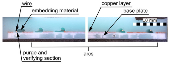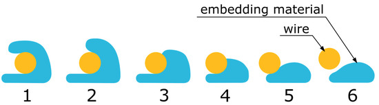 The embedding quality describes how completely the wire is surrounded by the polymer. Since the embedding of the wire on straight lines is always complete, only circular arcs were examined here. Unlike measuring the wire position, the embedding was evaluated using a grading system. The sorting into six clearly defined criteria enables an assessment to be made by looking at the samples. The criteria are explained below, as well as in Table 2, and are shown in Figure 7. The best possible embedding (grade 1) is achieved when the wire is embedded at least in a u shape and is covered by the polymer. Grade 2 is awarded when the wire is enclosed but not completely covered by the polymer. If the wire is not covered, a score of 3 is given if the top end of the polymer is above the wire, and a score of 4 is given if the wire is above the polymer. A score of 5 is given if the wire is not covered by the polymer but is resting on it. A score of 6 is given if the wire has already become detached.