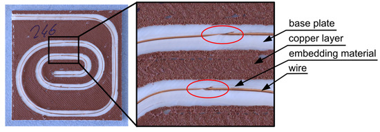 For several years now, additive manufacturing (AM) has been used more and more to enable the efficient use of resources and the fast and mold-free production of highly customized products and structures. It also enables the production of components that would not be possible using any other manufacturing process. In addition to their structural advantages, AM processes also offer the possibility of integrating further, e.g., conductive elements such as wires into the components during the manufacturing process, thus functionalizing them [1]. These conductors can be used, for example, to transmit currents [2], as coils [3], as heating elements [4], or to build sensors [1]. Typically, conductors are provided on separate boards, foils, or via cables and are mounted on the base component after it has been manufactured. Using AM methods, the conductive paths can be integrated directly into the structure of the component during the manufacturing process. This reduces the parts and assembly steps, which shortens the supply chain and, therefore, has the potential to make the entire process more stable. AM of conductive tracks can be performed by applying materials and semi-finished products like filaments with conductive additives [5], pastes and inks with conductive additives [2,6,7,8], low-melting-point alloys such as solder [9], or integrated wires [4,10,11,12,13].