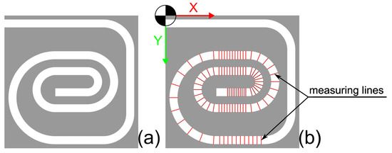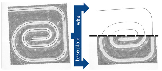 Due to the combination of low electrical resistance and high deformability for repeated mechanical loads, wires have superior properties compared to the processes mentioned in [2]. The properties of the wire are not changed during the printing process, as the wire is only deposited and embedded. Melting of the wire does not take place due to the relatively low temperatures required for the polymer printing process. There are two methods for depositing wires: In one method, an already-coated wire, also called prepreg, is deposited with one nozzle, similar to the CFF (Continuous Fiber Fabrication) printing process [11,12]. In the other, the wire is fed separately either through [4,14] or under the nozzle [10,13]. The separate feeding of the wire offers the possibility of applying varying amounts of coating polymer to the wire and even feeding it without polymer, which enables the design of functional elements, e.g., the winding of coils [3]. Compared to feeding through the nozzle, feeding under it allows for a greater variety of wire diameters, easier changing of wires and matrix materials, and reduces deformation of the wire due to larger bending radii during deposition. However, feeding under the nozzle requires an additional rotational axis, as the wire must be fed sideways in the direction of the print track. The additional axis leads to more complex path planning and control. At the same time, the additional axis can be used to correct the wire’s position in the print track by manipulating the direction in which the wire is fed into the track, whereas in systems where the wire is fed through the nozzle, the wire’s position can only be corrected by deflecting the entire nozzle to a larger radius. This leads to inaccuracies in the path design. While in the literature the wires were mostly integrated as a straight track [4] or in curves with large radii compared to the wire diameter [3,4], a displacement of the wires in the print track occurs especially in complex layouts with tight curves, such as those that could be used for sensors or optimized heating applications. In order to achieve optimal placement here, a correction model must be implemented in the printing process, which places the deposited wire precisely and, thus, enables more complex layouts. Two non-standard sections for the explanation of the manufacturing process (Section 2) and the developed correction model (Section 3) have been incorporated into the architecture of this paper.