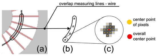 The wire position in the print track could not be determined using visual inspections or a microscope due to optical lens effects skewing the wire position in the transparent embedding polymer (see red markers in Figure 9), or due to the wire not being visible at all in the opaque polymer. Therefore, computed tomography (CT) was used as an imaging method to obtain a 2D view of the wire in the specimen. The images were taken with an X-ray inspection system (V|tome|x S 240 by GE Sensing & Inspection Technologies, Wunstorf, Germany) with 120 kV voltage, 200 µA current, and an exposure time of 333 ms. To achieve sufficient contrast to the wire, a layer of copper-filled filament was printed onto the test specimens.