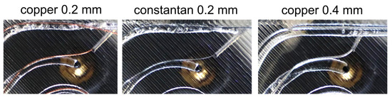 In this research, print tracks made of wire and polymer were applied to base parts. Here, the material of the base part was selected to that it matched the polymer of the print track to guarantee optimal adhesion. Due to their good processing properties and wide range of applications, PLA (polylactide) [16] and PETG (polyethylene terephthalate glycol) [17] are currently the most popular polymers in 3D printing. Because the WEAM print tracks should be integrated into regular 3D-printed objects, these materials were investigated in this study. The used PLA was manufactured by Raise3D, Irvine, CA, USA, the PETG by FILAMENTWORLD, Neu-Ulm, Germany. They also differ in their crystalline structure—PLA is a semi-crystalline polymer and PETG is an amorphous polymer [18,19]—and, thus, in their processing properties. For the later use of CT (computed tomography) imaging to examine the position of the wire in the print track, an additional layer of copper-particle-filled PLA from Formfutura, Nijmegen, The Netherlands [20] was applied to the base parts. This provided contrast to the wire. The wires were selected due to their possible applications, as shown in Table 1. The WEAM tool head is currently limited on the low end to ø 0.2 mm wire due to buckling of smaller wires. Especially for sensor structures like strain gauges, even thinner constantan would be preferable but could not be tested. All tested wires where manufactured by BLOCK, Verden, Germany.