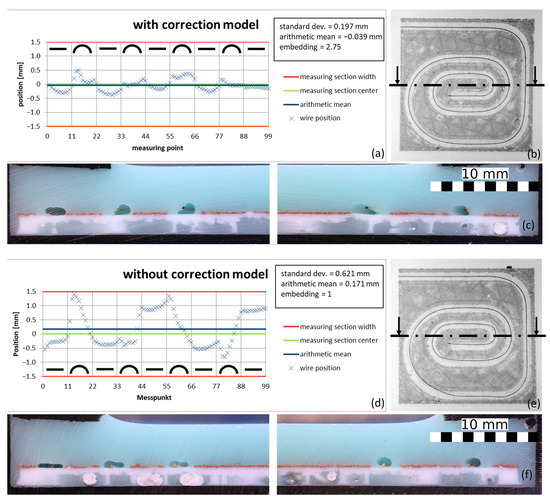 Using a newly developed tool head with an additional rotational axis and a wire feed, wires can be directly processed in the fused filament fabrication (FFF) process. Thus, electrical structures such as conductive paths, coils, heating elements, or sensors can be integrated into polymer parts. However, the accuracy of the wire deposition in curved sections of the print track is insufficient. To improve the wire position, a geometric correction model was set up, converted into G-code, and validated using test prints for different wire parameters. For this, a sample of printed arcs was evaluated regarding wire position and embedding quality using various visual methods. This also determined the optimal cooling time for the model. The process parameters extrusion coefficient and feed were then varied to identify optimal process parameters for a stable and at the same time efficient process. By varying the wire (copper, constantan) and polymer material (PLA, PETG), the model was checked for general validity. It was found that the position of the ø 0.2 mm wire can be improved with the correction model. Different sets of parameters can be found that enable good quality of embedding and wire position.