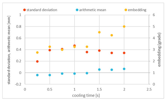 The following figures show the influence of the cooling time for the correction model on the wire position (arithmetic mean, standard deviation) and embedding quality for different parameter sets.