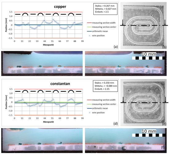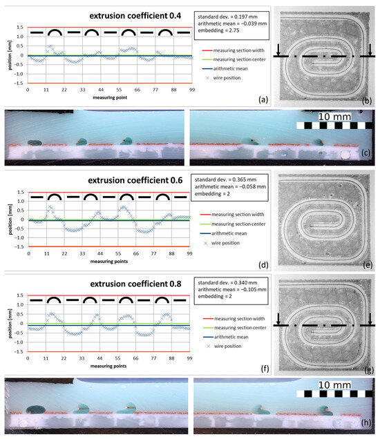It was also shown that, while a higher extrusion coefficient slightly improves positioning and embedding, a lower extrusion coefficient achieves sufficiently good results. Therefore, an extrusion coefficient of 0.4 was chosen as optimal for a feed of 1000 mm/min in terms of resource and process efficiency and functionality. The variation of both the wire and the embedding material showed only a slight influence on the embedding quality and the position of the wire, which suggests that this model is generally valid for different materials, within certain limits.