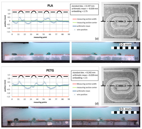Although PETG with 2.5 shows better embedding than PLA with 2.75, the standard deviation of 0.242 mm is higher than that of PLA, with 0.197 mm. However, the differences between the two polymers are not that great, which means that a general validity can also be concluded for the embedding material used, provided that the characteristic temperatures of the polymer are within similar limits.