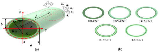 Geometric schematic of the elliptic cylindrical shell and cross-sectional view of FG-CNTRC material. (a) model schematic; (b) material distribution schematic.