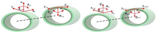 To accurately capture high-order vibration modes and responses, the method incorporates a multi-segment partitioning approach that divides the structure into segments for efficient computation. Accordingly, the FG-CNTRC elliptic cylinder is segmented into N parts along its length. When the piecewise structure is completed, the elliptic cylinder segment can be regarded as a substructure with a free boundary at both ends. Figure 2 illustrates the displacement relationship between adjacent subsectional structures. It is feasible to discretize the displacement field by using the admissible function because the boundary conditions of the elliptic cylinder segment should not be imposed at this time. The boundary conditions of the entire elliptic shell are simplified to include only the interfaces between adjacent segments and the actual geometric boundaries at both ends. A modified variational principle is applied to formulate the constrained system for FG-CNTRC elliptic cylinders. This approach works by finding the minimum of an adjusted variational function [42]: