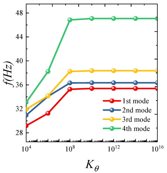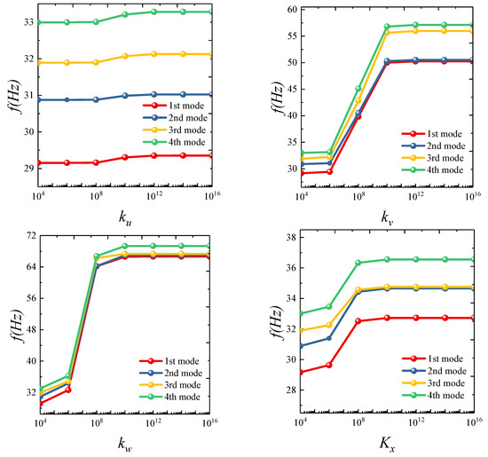 Subsequently, the influence of different boundary parameters on the natural frequencies of the elliptic cylinder was examined. To assess the role of various spring stiffness values in this study, only one spring stiffness was varied between 104 and 1016, while the other four were kept at zero. Figure 3 presents a trend of the first four natural frequencies as each of the five spring stiffness values changes. It was observed that each spring stiffness exhibits a different sensitivity range. For instance, kv shows minimal frequency variation between 104 and 106, followed by an increase from 106 to 1010, and stabilizes beyond 1012, indicating convergence. In contrast, Kx has a sensitivity range from 106 to 108. Although this phenomenon supports the correctness of the previously set boundary condition parameters, three types of elastic constraint boundaries are further defined to clarify the effect of boundary spring stiffness on structural vibration characteristics: