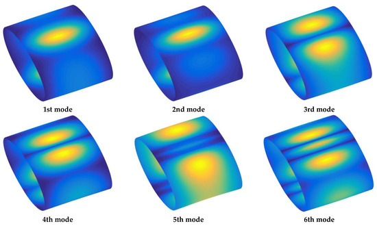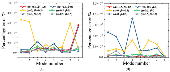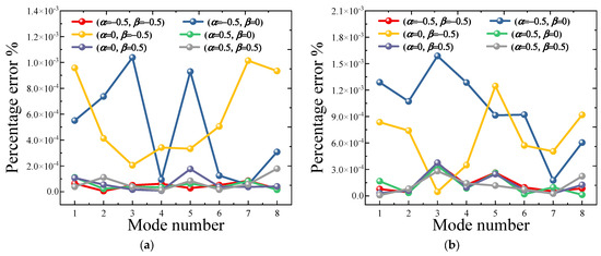 Lastly, the influence of Jacobian parameters α and β on the vibration characteristics of the FG-CNTRC elliptic cylinder is further discussed. As we stated in the previous paper, because MVP and LSWRM are used, the boundary conditions need not be taken into account in the selection of displacement functions. This greatly reduces the inherent requirements for displacement functions. In this paper, we propose a unified Jacobian orthogonal polynomial with linear independence and regular differentiation to express the displacement admissible function. This means that when Jacobian parameters are different, different types of polynomial functions can be obtained. For example, several typical polynomials include the Chebyshev polynomial (α = β = −1/2), the second kind of Chebyshev polynomial (α = β = 1/2), and the Legendre polynomial (α = β = 0). Figure 4 shows the percentage error in the natural frequency obtained using different Jacobi parameters. Clearly, regardless of the choice of Jacobi parameters, the proposed method demonstrates high computational accuracy, with a maximum prediction error () not exceeding . In subsequent computational analyses, the impact of varying parameters can be ignored. For consistency, we choose α = 0, β = 0 as the Jacobian parameters.
