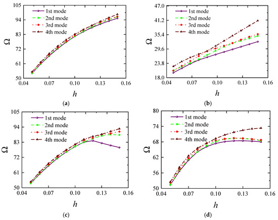The influence of FG-CNTRC elliptical cylindrical shell thickness on frequencies Ω: (a) C-C boundary; (b) C-F boundary; (c) E1-E1; (d) E4-E4.