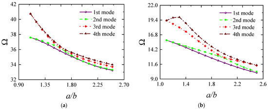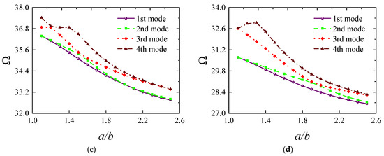 The effect of the radius ratio a/b of FG-CNTRC elliptical cylindrical shell on natural frequencies Ω: (a) C-C boundary; (b) C-F; (c) E1-E1; (d) E4-E4.