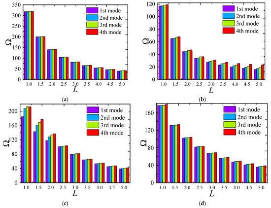 The effect of the length L of the FG-CNTRC elliptic cylindrical shell on natural frequencies Ω (a) C-C; (b) C-F; (c) E1-E1; (d) E4-E4.