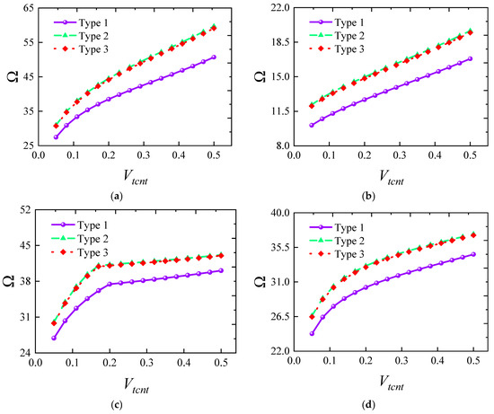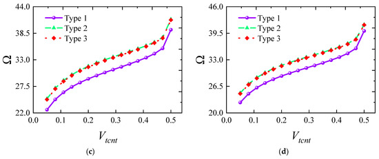 Variation in the fundamental frequency parameters Ω versus Vtcnt for FG-CNTRC elliptic cylinder shells: (a) C-C; (b) C-F; (c) E1-E1; (d) E4-E4.