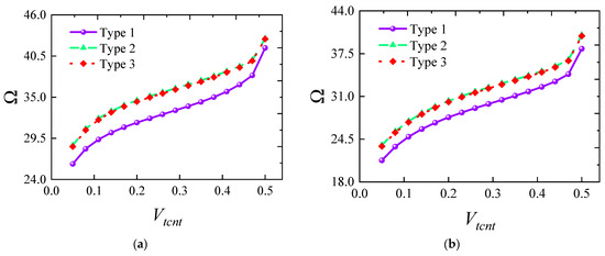 Variation in the fundamental frequency parameters Ω versus Vtcnt for FG-CNTRC elliptic cylinder shells with different CNT types: (a) CNT-FGX; (b) CNT-FGO; (c) CNT-FGV; (d) CNT-FGΛ.