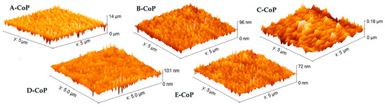 The deposited organotin-CoP in PEDOT:PSS matrix films were initially analyzed for their topography, and 3D AFM images are presented in Figure 2. As can be seen in the 3D images, all films show a relatively uniform morphology with small ridges and valleys. According to these images, the film with C-CoP is the most heterogeneous, and when reviewing Table 1, it can be observed that both the root mean square (RMS) and average (Ra) roughness are the highest. However, it should be noted that the roughness for all films is very low, which can guarantee, on the one hand, that spin-coating is a suitable technique for the fabrication of this type of film with dispersed heterojunction architecture. PEDOT:PSS works as an excellent matrix in this type of film since it incorporates tin complexes doped with CoP. On the other hand, the low roughness in the films will help the efficient transport of electrical charges. The homogeneity and uniformity in the films will avoid the formation of traps and with them losses in the transport of charges. Furthermore, adequate adhesion would be expected at the interface between the composite film and the electrode surface in the organic solar cell. Regarding the tensile strength (σ) shown in Table 1, variations of up to two orders of magnitude are observed. The films with organotin complexes A, D, and E show the highest mechanical resistance, followed by C, and the film with the lowest σ is the one with complex B. Considering that all films were manufactured under the same conditions, these results indicate that it is the type of radical in the structure of the organotin complex that is responsible for the molecular arrangement of the organotin inside the dispersed heterojunction, and with this, the value of its maximum mechanical resistance in the presence of charges. It seems that the doped B complex with the methyl radical is the least able to be incorporated into the PEDOT:PSS matrix, although in terms of Knoop hardness (HK), it is within the range obtained by the rest of the films. Although the film with the D complex presents the greatest HK, it varies very little between films, which implies that all films have similar strength, ductility and wear resistance. PEDOT:PSS functions primarily as a matrix, and its effect is to incorporate both organotin complexes and porphine and further enhance the proper morphology and topography of the films. The effect of PEDOT:PSS is directly related to the mechanical properties of organotin-CoP/PEDOT:PSS films.