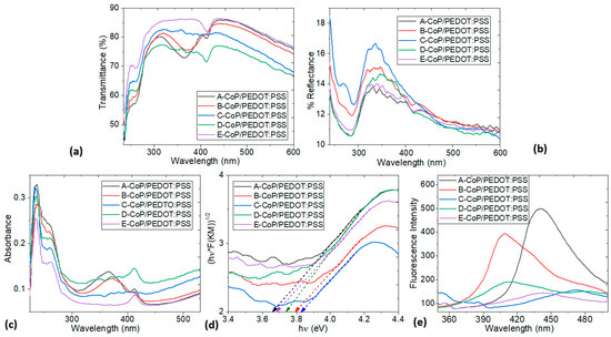 (a) % transmittance, (b) % reflectance, (c) absorbance, (d) Kubelka–Munk function, and (e) fluorescence of the composite films.