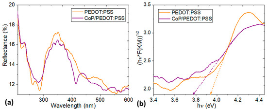 (a) % reflectance and (b) Kubelka–Munk function of the PEDOT:PSS and CoP/PEDOT:PSS films.
