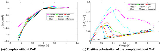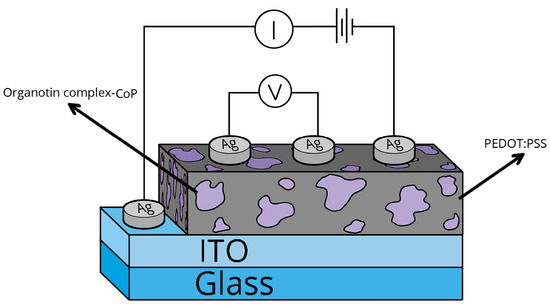 Simple devices with the ITO/organotin complex-CoP/PEDOT:PSS/Ag conformation were fabricated to evaluate the electrical behavior of the composite films (see Figure 5). The device is rigid with a glass substrate; the ITO film acts as anode, and the four silver dots as cathode. To analyze the electrical properties of the manufactured devices, they were subjected to electrical tests under different light conditions. The tests involved applying electrical voltage ranging from to volts under exposure to different types of light and darkness, specifically natural, white, blue, yellow, orange, red, and ultraviolet-visible (UV) lights. Since the devices have a cross-section of 5.77 mm2, the devices’ current density–voltage curves (J-V) are shown in Figure 6. Additionally, Figure 7 shows the behavior of the J-V curves of the complex without CoP doping.