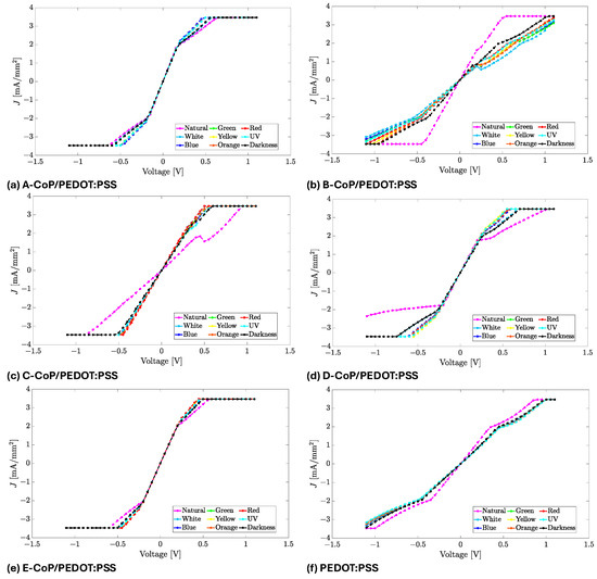 As shown in Table 4, the free carrier density increases as the voltage increases; hence, the order of magnitude of the approximations in devices A-CoP to E-CoP is , while the PEDOT:PSS device has a higher free carrier density on the order of . One of the most notable aspects of all fabricated devices is their linear ohmic regime. In this regard, it is evident that the conduction rates in this regime differ between devices (see Figure 6). The approximation of conduction rates in the ohmic regime from 0 to volts for each device under each type of light used and the root mean squared error (RMSE) of the approximation are shown in Table 5.