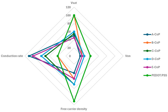 According to Table 5, the devices with the highest conduction rate in the ohmic regime are A-CoP and E-CoP, while devices C-CoP and D-CoP show an intermediate conduction rate. On the other hand, devices B-CoP and PEDOT:PSS exhibit the lowest conduction rates in this regime. Based on the results from Table 3, Table 4 and Table 5, each fabricated device exhibits different electrical characteristics, such as the conduction rate in the ohmic regime, the free carrier density , the saturation voltage , and the transition voltage between the ohmic and SCLC regimes. Figure 8 shows a comparative graph of these electrical properties.
