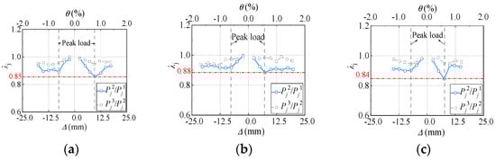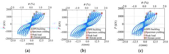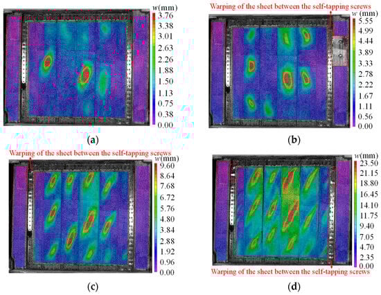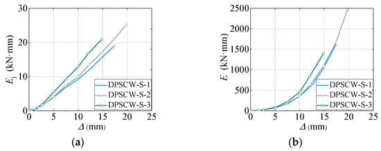 - The specimens achieved yield drift ratios of 1/286 to 1/225, ultimate drift ratios of 1/63 to 1/94, and ductility coefficients of 3.09 to 3.51, all meeting the deformation capacity requirements in the “Code for Seismic Design of Buildings”. This confirms the effectiveness of self-tapping screw connections in ensuring reliable force transfer between the profiled steel plates and boundary members.