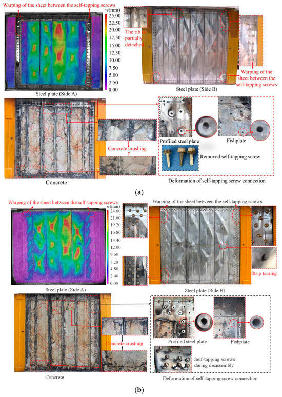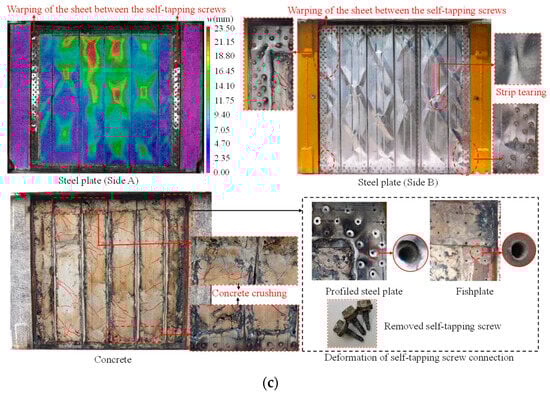- The self-tapping screw-connected DPSCW specimens exhibited a failure progression starting with local shear buckling of the strips, followed by inclined tension fields anchored by the concrete-embedded ribs. The wall concrete experienced compression-bending failure in several concrete columns, while the self-tapping screw connections remained intact with no significant damage.