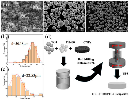 The SEM images of (a) CNP powders, (b) TC4 powders, (c) Ti1400 powders, and (d) the preparation process of (TiC + Ti1400)/TC4 composites; (b1) histogram of TC4 powders’ size distribution; (c1) histogram of Ti1400 powders’ size distribution.