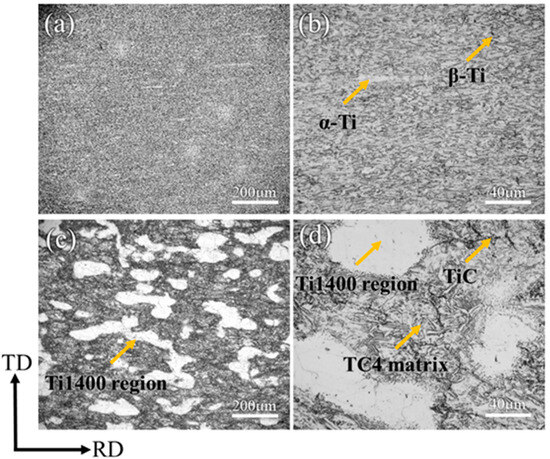 3.1. Microstructure of (TiC + Ti1400)/TC4 Composites