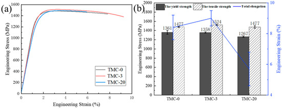 The mechanical properties of TMC-0, TMC-3, and TMC-20 composites are presented in Figure 5 and Table 2. All the samples showed high yield strength and tensile strength (Figure 5a). The yield strength and tensile strength of the TMC-0 samples reached 1361 MPa and 1477 MPa, respectively, with an elongation of about 8.4%. The TMC-3 sample performed better, with yield strength and tensile strength of 1358 MPa and 1524 MPa, respectively, and an elongation of about 9%. The TMC-20 sample had a yield strength and tensile strength of 1267 MPa and 1477 MPa, respectively, and an elongation of about 5.7%. Figure 5b shows the average values of the mechanical properties, which can indicate that the specimens are more repeatable and the properties are more stable. With the addition of Ti1400, the yield strength of the TMC-3 sample was not much different from that of the TMC-0 sample, but the tensile strength was increased by about 47 MPa, and the elongation was also improved. This indicates that a small addition of Ti1400 can increase the strength of the composite while minimizing the loss of elongation. The elongation of the TMC-20 sample was 32% lower compared to the TMC-0 sample, and the yield strength was 7% lower than that of TMC-0. At higher Ti1400 content, the composites showed severe plasticity loss.