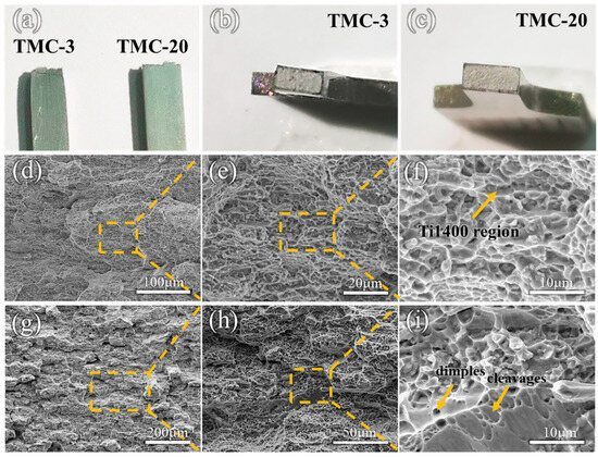 The fracture surfaces of the samples are shown in Figure 6a, where the TMC-3 sample exhibits significant necking and the TMC-20 sample shows no significant deformation. Observing the fracture surface, the proportion of the TMC-3 fiber area increased significantly (Figure 6b). In contrast, the macroscopic fracture surface of TMC-20 is relatively flat and exhibits granular features, predominantly radial zones with rough radial ridges (Figure 6c). These features indicate the nature of brittle fracture. In Figure 6d–f, TMC-3 forms many equiaxed dimples under tensile stress. These dimples are distributed with second-phase particles, and fine TiC particles are also observed in the dimples, which indicates that the bonding between the TiC particles and the matrix is still tight even during the fracture process, thus providing reformation resistance and load transfer capability. Compared to the fracture surface of TMC-3, some areas of TMC-20 showed larger and deeper dimples as well as distinct tear ridges, which indicate that the sample has excellent toughness. However, the dimples on the tear ridges show signs of stretching, suggesting an uneven distribution of stresses within the sample during stretching (Figure 6g–i). Similar conclusions were drawn for the titanium matrix composites prepared by Krystian Zyguła et al., and the diffusion behavior and possible precipitation capacity of the TiC and TiB phases during hot pressing were investigated in detail [47].
