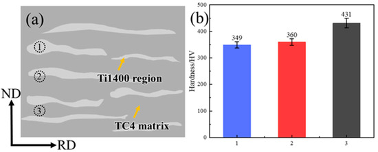 This study tested the Vickers hardness of the TC4 matrix, the Ti1400 region, and their interface in the composites. Figure 8a was a schematic diagram showing the locations where hardness was tested. The Vickers hardness values for the interior of the Ti1400 region, its interface with the TC4 matrix, and the TC4 matrix were 349 HV, 360 HV, and 431 HV, respectively, as shown in Figure 8b. The Vickers hardness of the TC4 matrix was significantly higher than that of the Ti1400 region, with a difference of nearly 100 HV. The strength of the Ti1400 region was lower than that of the TC4 matrix because Ti1400 was a near-β titanium alloy with a low Mo equivalent. After rolling at 1173 K and cooling, the Ti1400 region retained more β-phase, which had lower strength in the solid solution state, leading to a reduction in the strength of the Ti1400 region. Therefore, the presence of 3 wt.% Ti1400 did not significantly affect the strength of the composites, but when its content increased to 20 wt.%, it reduced the strength of the composites. Subsequent work will involve aging treatment of the composites, which will significantly enhance the strength of the Ti1400 region and thereby contribute to improving the strength of the composites.