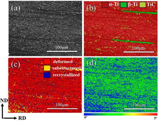In Figure 9a,b, the Ti1400 region in the composites was mainly composed of the β-phase and was distributed along the rolling direction. Due to the absence of further annealing treatment, the composites were still dominated by deformed structures, with only a small portion of recrystallized structures, as shown in Figure 9c. Therefore, the composites still exhibited high residual stress, as illustrated in Figure 9d. Dislocations generated by rolling deformation accumulated near TiC and at α/β interfaces, and these dislocations were not fully recovered after hot rolling. The remaining dislocations were mainly stored near TiC and at α/β interfaces, with fewer within the β-phase. This provided the possibility for subsequent coordinated deformation of the β-phase. When a small amount of Ti1400 was added, the Ti1400 regions were dispersed in the matrix. These smaller regions and their interfaces with the matrix exerted weaker hindrance to dislocations, thus not significantly reducing the strength of the composites. Due to the small number and uniform dispersion of Ti1400 regions, they did not hinder plastic deformation of the composites but instead promoted dislocation slip through coordinated deformation, helping to maintain or improve the ductility of the composites.