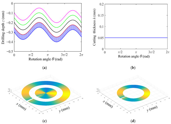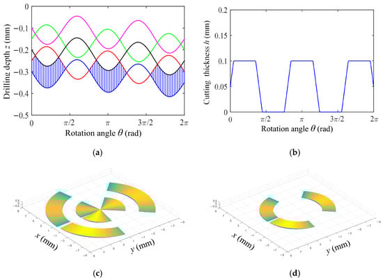 According to Equation (11), when the frequency rotation ratio ωf is an integer, the dynamic cutting thickness is always greater than zero. Figure 2 shows the change curve of the drill head’s axial movement track and the dynamic cutting thickness with the drill rotation angle when the frequency rotation ratio ωf is an integer of 2, and the shape of each cutter tooth without deformation.