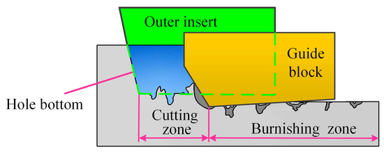 The extrusion process of the guide block is illustrated in Figure 4. There are obvious differences between the cutting area of the sizing edge of the external cutter teeth and the extrusion deformation area of the guide block. Due to the tensile stress and tearing on the surface of the hole wall formed by the cutter teeth cutting, the hole wall area formed by the cutting edge of the external cutter teeth has an uneven surface topography of the peak and trough caused by the cutting residue, and the finish of the hole wall is poor [26].