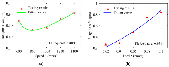 Design Expert software was used to perform second-order regression fitting for hole wall surface roughness combined with BBD experimental measurement results exhibited in Table 9. The second-order prediction model of hole wall surface roughness for BTA deep hole axial vibration drilling was obtained, as shown in Equation (14), and the fitting results of factor coefficients were explained in Table 10.