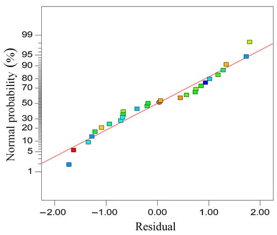 The complex correlation coefficient R2 = 0.9948 indicates that the predicted value of the model has a good agreement with the measured value. The correction correlation coefficient Adj R2 = 0.9888 indicates that the model can explain 99.48% of the variation of response value. The residual normal probability of the surface roughness prediction model is shown in Figure 8. It can be seen that there is a straight line with an inclination angle of 45°, which represents the predicted surface roughness values under different experimental conditions. The box represents the experimental value; theoretically, all experimental values should be on this straight line. There is a certain deviation between the experimental values and the theoretical predicted values, but most of the experimental values are very close to the theoretical straight line, indicating that the proposed prediction model can better reflect the real data situation. The residual handicap is distributed near the normal distribution line, indicating that there is no large deviation in the data and the model is well fitted.